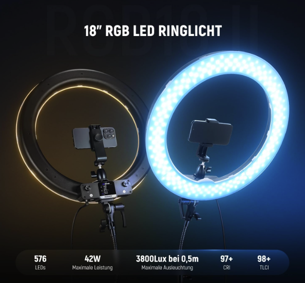 NEEWER 18" RGB LED Ring Light APP Control with Stand and Phone Holder 42W Dimmable, 2500-10,000K, GM ± 50 Bi Colour, CRI97+/TLCI98+, 360° Full Colour for Selfie, TikTok, Vlog Neupreis 210 Euro https://amzn.eu/d/gEDdNq1