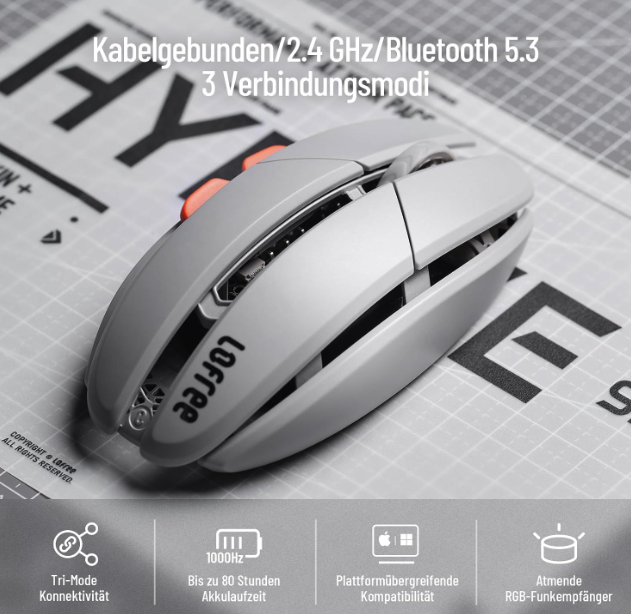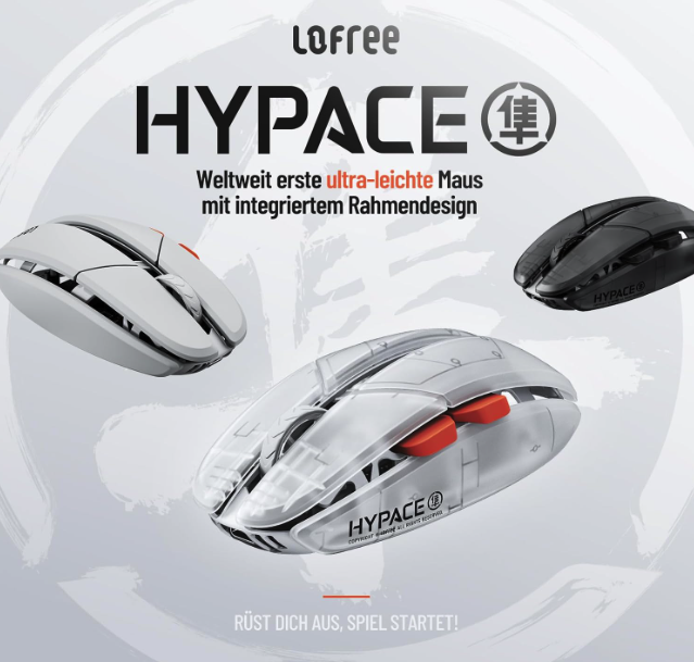 Hypace Ultra-Leichtgewichtige Gaming-Maus (47g), PAW3950 Sensor, 40K DPI, 8K Polling Rate, Magnesium-Legierung, Tri-Modus (Bluetooth/2.4GHz/Kabel), 100h Akku für PC/Mac (Transparent)
